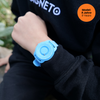 Bubbles Blue von Magneto Watch bringt eine frische Brise an jedes Kinderhandgelenk. Zwei Magnetkugeln – eine größere Innenkugel für die Stunden und eine kleinere Außenkugel für die Minuten – sorgen für ein außergewöhnliches Zeitablesen, das neugierige Blicke auf sich zieht. Das robuste Kunststoffgehäuse (ABS) ist angenehm leicht, während das blaue Silikonarmband mit blasenartigem Print an Seifenblasen erinnert. So wird das Erlernen der Uhrzeit zu einem fröhlichen Erlebnis – und Kinder haben immer einen coolen Hingucker am Handgelenk.